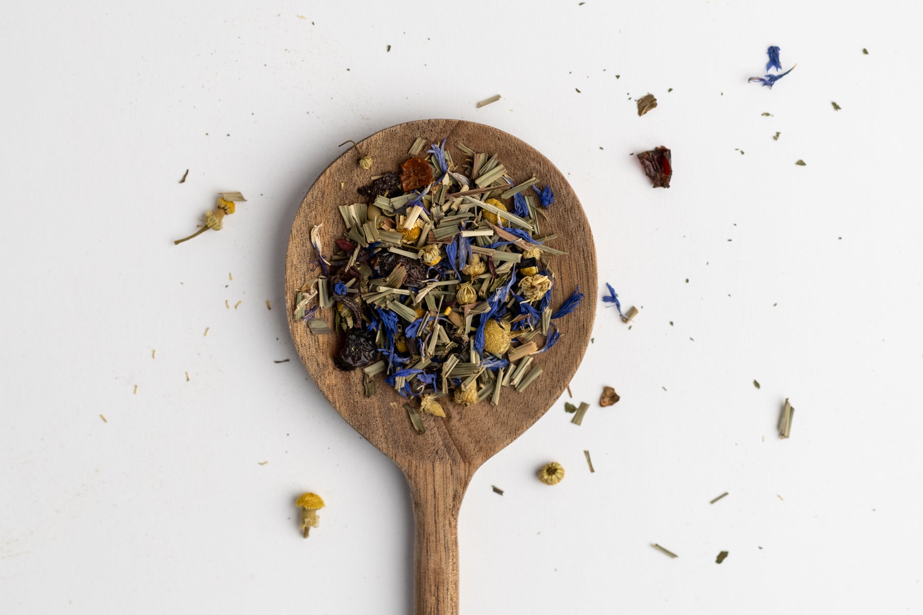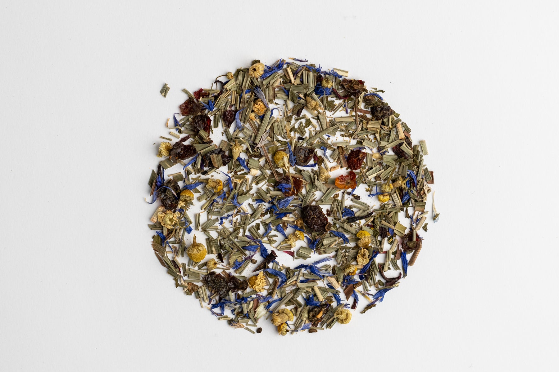 Crafted with chamomile, lemongrass, peppermint, and rosehip, this caffeine-free tea gently guides you into a state of calm. The floral notes of chamomile and rosehip ease tension, while lemongrass and peppermint offer a refreshing, grounding finish that helps release the stress of the day.