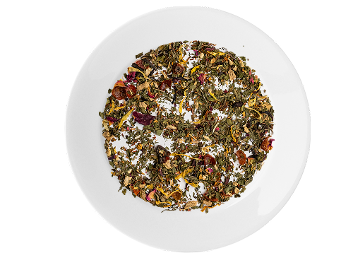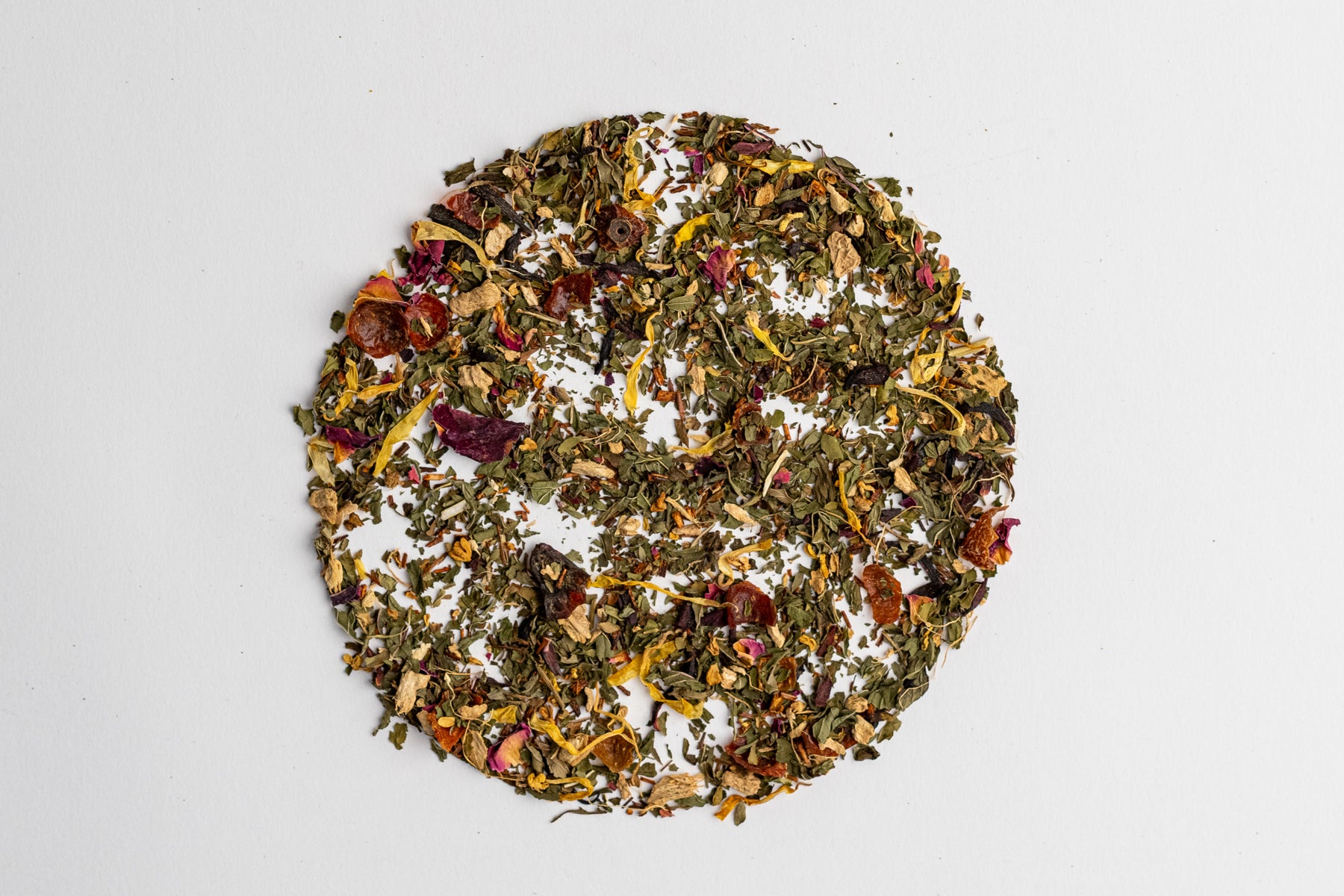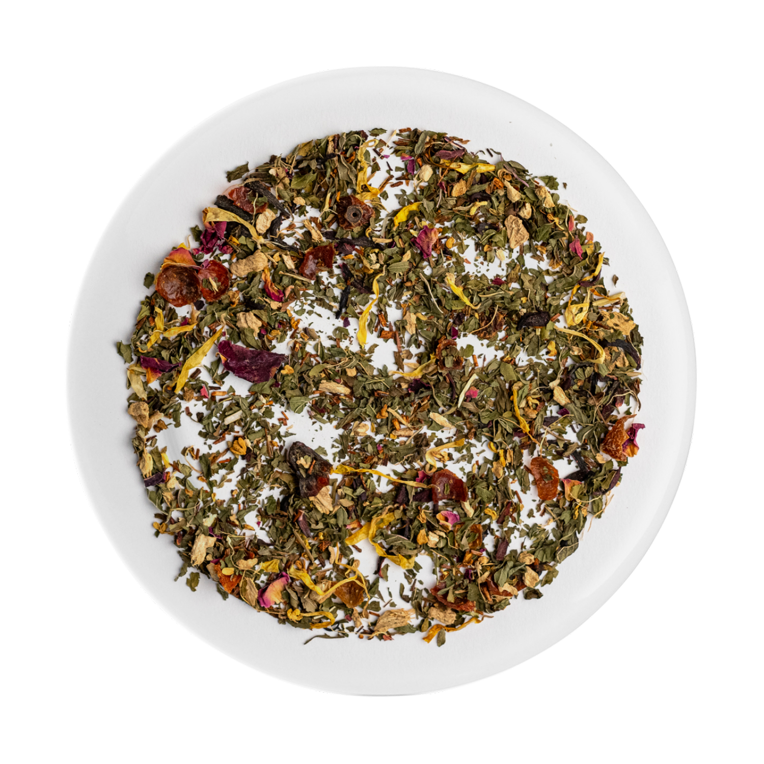 Crafted with a refreshing mix of peppermint, spearmint, and ginger, this tea is designed to soothe digestion, ease nausea, and provide a natural sense of renewal. Infused with hibiscus, rose, and calendula petals, it delivers antioxidant-rich benefits that help strengthen the immune system and reduce inflammation. Rooibos and rosehip bring an extra layer of nourishment, supporting healthy skin, relaxation, and overall well-being—all without caffeine.